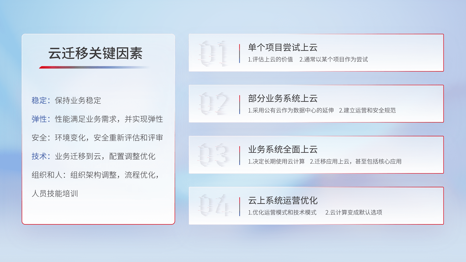 结合实际业务,,,从规划设计、、云平台选型、、、、云原生改造、、、数据迁移、、、、集成交付,,,迁移全过程为客户识别最佳上云路径,,做好风险识别管理,,,设计网络架构、、身份权限、、、、安全审计合规、、操作审计、、、日志审计、、、、监控告警策略、、、多站点容灾设计等,,,对云上基础设施进行整体规划,,提升IT治理水平,,以满足弹性、、高可用、、高性能的需求。。。