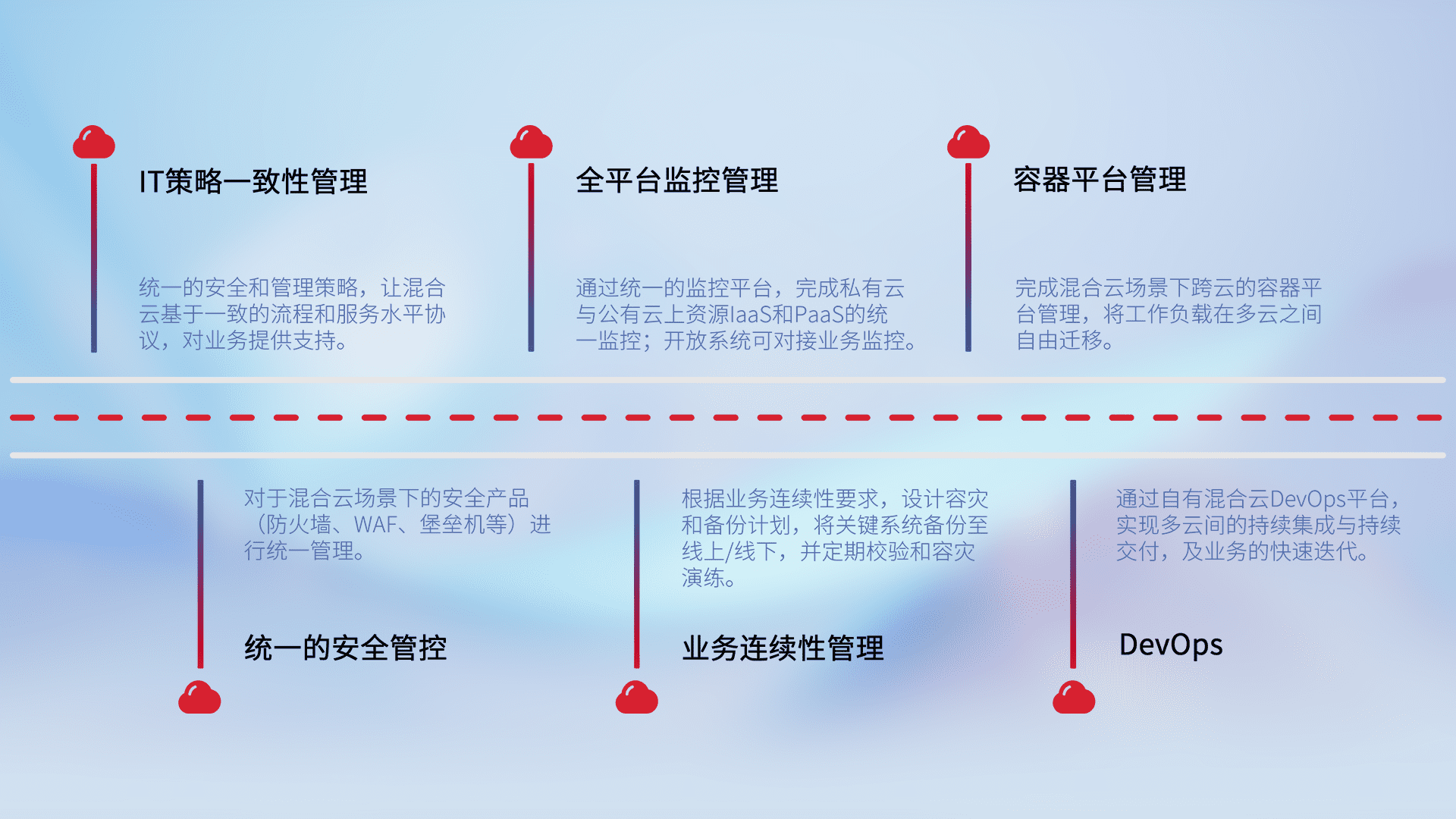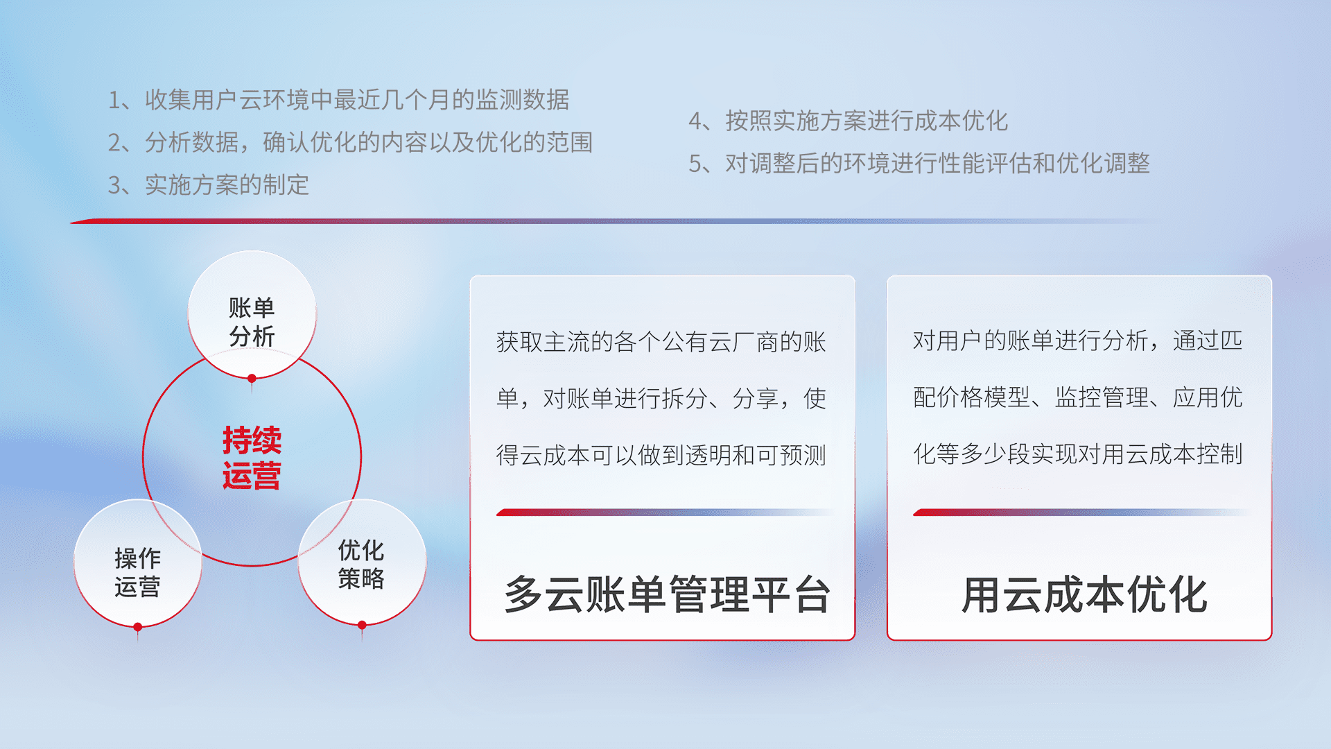 通过多云纳管,,,,以统一的资源数据模型把客户的云资源进行抽象和封装,,进而实现对多云资源的统一操作,,,保障云资源管理的可靠性、、稳定性与可用性。。。。量身定制化运维内容,,,配置、、、开发运维、、、、补丁管理、、备份、、监控、、、、认证和访问管理、、、、审计和日常巡检等,,保障在用云过程中的可靠度,,稳定度以及高可用率。。。。