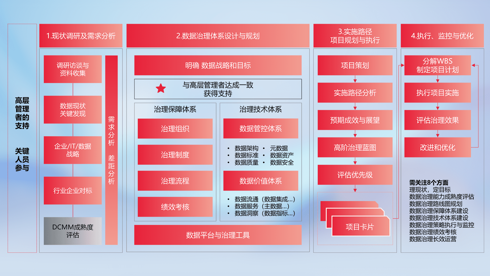 制定并执行统一的数据标准,,,规范数据定义和格式,,,,消除冗余和不一致性,,,,实现跨部门和跨系统的数据一致性,,,,为企业提供标准化的数据基础。。。。